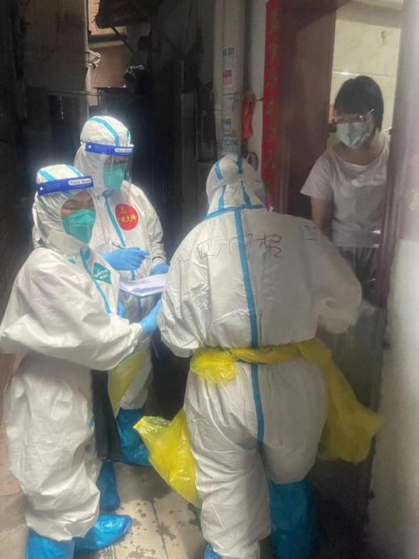 ▲穗新集團的隊員配合醫務人員上門開(kāi)展核酸檢測工作