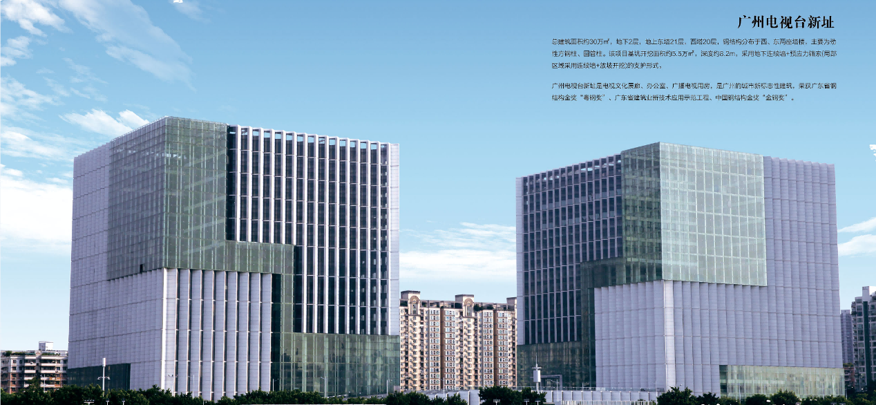 項目是電視文化展廊、辦公室、廣播電視用房,是廣州的城市新标志性建築,由屬下一建集團承建。項目總建築面(miàn)積約30萬平方米,地下2層,地上東塔21層,西塔20層,鋼結構分布于西、東兩(liǎng)座塔樓,主要爲勁性方鋼柱、圓管柱。海珠區將(jiāng)盤活廣州國(guó)際媒體港東塔,打造文化創意智慧園區。