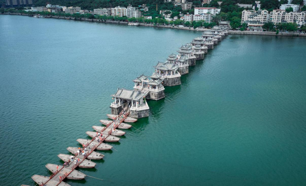 廣濟橋主體爲浮梁結合結構,由東西兩(liǎng)段石梁橋和中間一段浮橋組合而成(chéng),石梁橋由橋墩、石梁和橋亭三部分組成(chéng)。東邊梁橋長(cháng)283米,有橋墩12個和橋台1座,橋孔12個; 西邊梁橋長(cháng)137米,有橋墩8個,橋孔7個。施工團隊确立了保存原型制、原結構、原材料、原工藝的“四保存”修繕原則,力求最大限度地保存橋體原有風貌,使其更好(hǎo)地延續傳遞傳統文化價值。